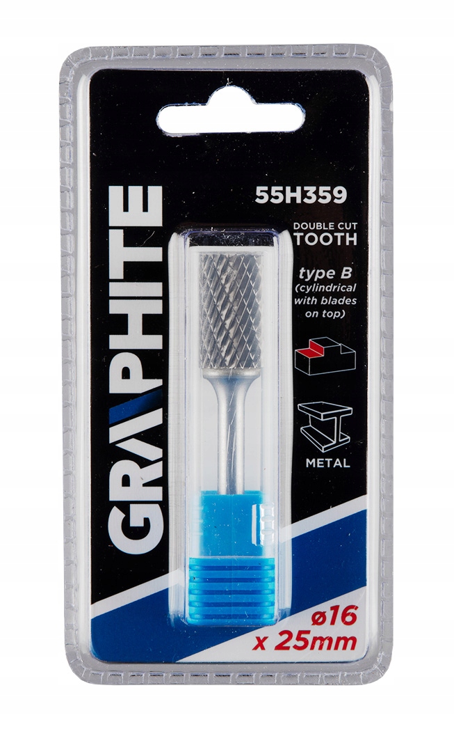 Frez do metalu GRAPHITE (nr ref. 55H359) typu B (walcowy z ostrzami na górze) i rozmiarze 16 x 25 mm to narzędzie przeznaczone do szlifierki prostej służące do skrawania lub piłowania obrabianej powierzchni. Przeznaczony do prac w materiałach takich jak metal, aluminium i tworzywa sztuczne. Zastosowanie węglika spiekanego sprawia, że narzędzie ma wysoką twardość oraz odporność na zużycie ścierne. Frez ten cechuje się podwójnymi nacięciami, które pozwalają na łatwe usuwanie naddatków w obrabianych materiałach.