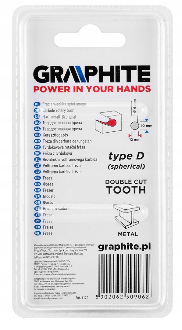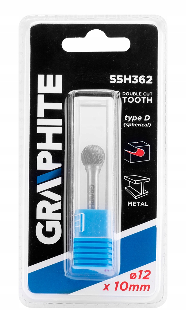 Frez do metalu GRAPHITE (nr ref. 55H362) typu D (kulisty) i rozmiarze 12 x 10 mm to narzędzie przeznaczone do szlifierki prostej służące do skrawania lub piłowania obrabianej powierzchni. Przeznaczony do prac w materiałach takich jak metal, aluminium i tworzywa sztuczne. Zastosowanie węglika spiekanego sprawia, że narzędzie ma wysoką twardość oraz odporność na zużycie ścierne. Frez ten cechuje się podwójnymi nacięciami, które pozwalają na łatwe usuwanie naddatków w obrabianych materiałach.