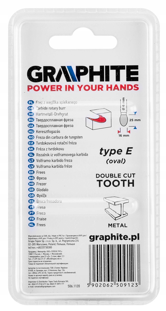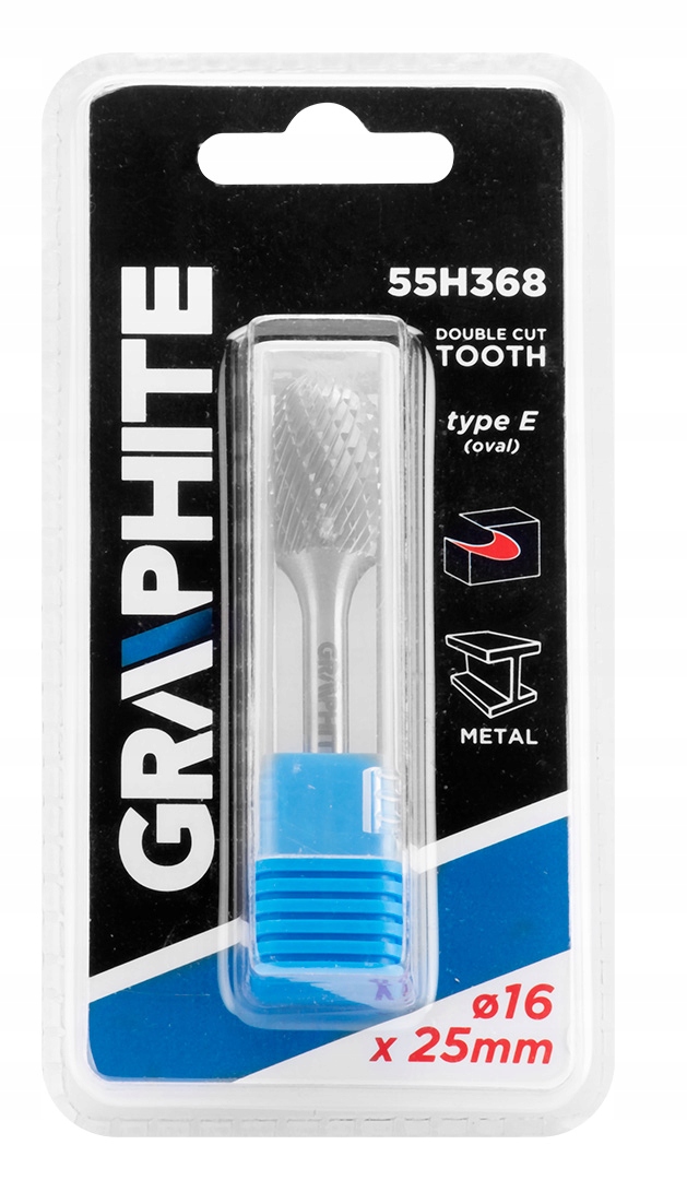 Frez do metalu GRAPHITE (nr ref. 55H368) typu E (owalny) i rozmiarze 16 x 25 mm to narzędzie przeznaczone do szlifierki prostej służące do skrawania lub piłowania obrabianej powierzchni. Przeznaczony do prac w materiałach takich jak metal, aluminium i tworzywa sztuczne. Zastosowanie węglika spiekanego sprawia, że narzędzie ma wysoką twardość oraz odporność na zużycie ścierne. Frez ten cechuje się podwójnymi nacięciami, które pozwalają na łatwe usuwanie naddatków w obrabianych materiałach.