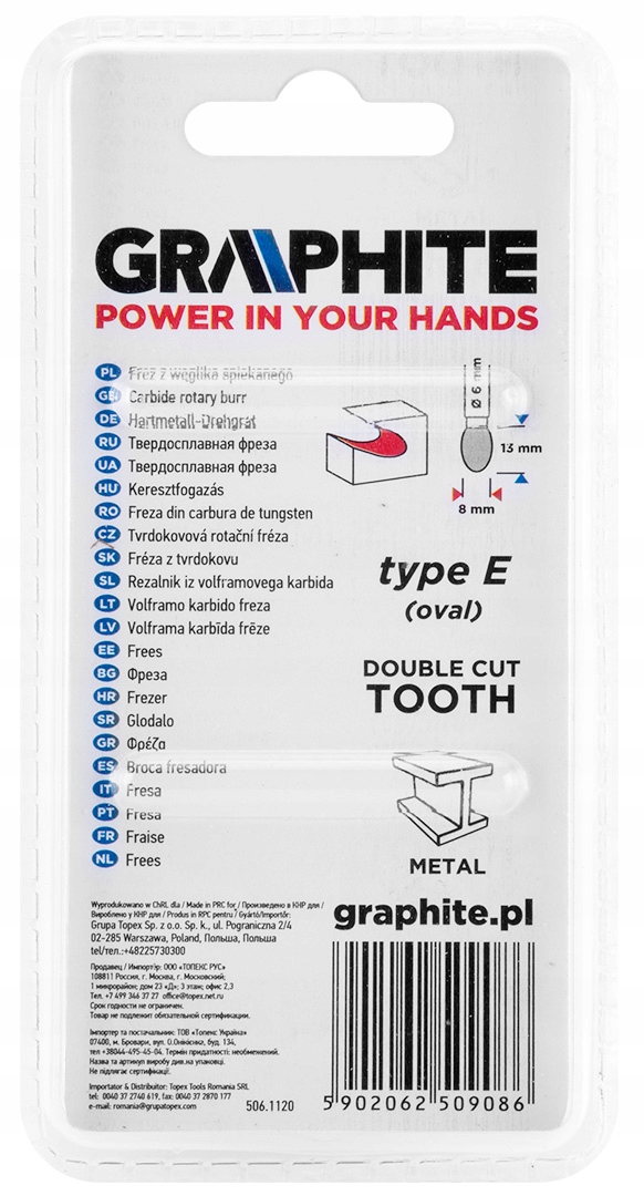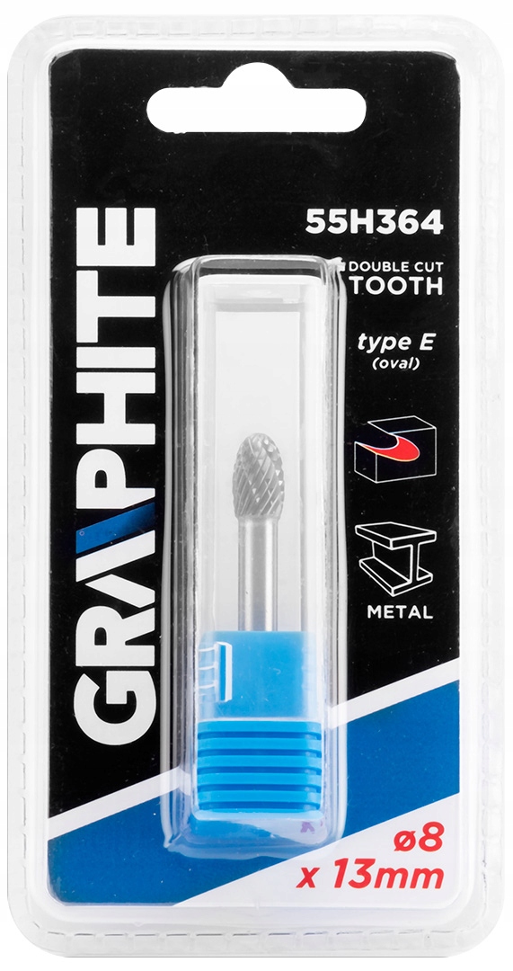 Frez do metalu GRAPHITE (nr ref. 55H364) typu E (owalny) i rozmiarze 8 x 13 mm to narzędzie przeznaczone do szlifierki prostej służące do skrawania lub piłowania obrabianej powierzchni. Przeznaczony do prac w materiałach takich jak metal, aluminium i tworzywa sztuczne. Zastosowanie węglika spiekanego sprawia, że narzędzie ma wysoką twardość oraz odporność na zużycie ścierne. Frez ten cechuje się podwójnymi nacięciami, które pozwalają na łatwe usuwanie naddatków w obrabianych materiałach.