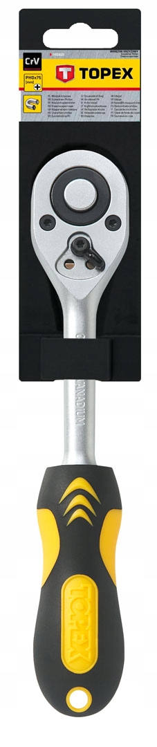 Grzechotka 1/4” TOPEX (nr ref. 38D501) o długości 150 mm. Wykonana z wysokiej jakości stali chromowo-wanadowej, zapewniającej długą żywotność produktu. Wyposażona w mechanizm zapadkowy z 45 zębami zębatki oraz przełącznik kierunku obrotów. Ergonomiczny uchwyt z tworzywa sztucznego pokryty antypoślizgowym materiałem zapewnia bezpieczeństwo i komfort podczas pracy. Wykonanie zgodnie z normą DIN 3122 jest gwarantem niezawodności produktu. Marka TOPEX skierowana jest do majsterkowiczów.