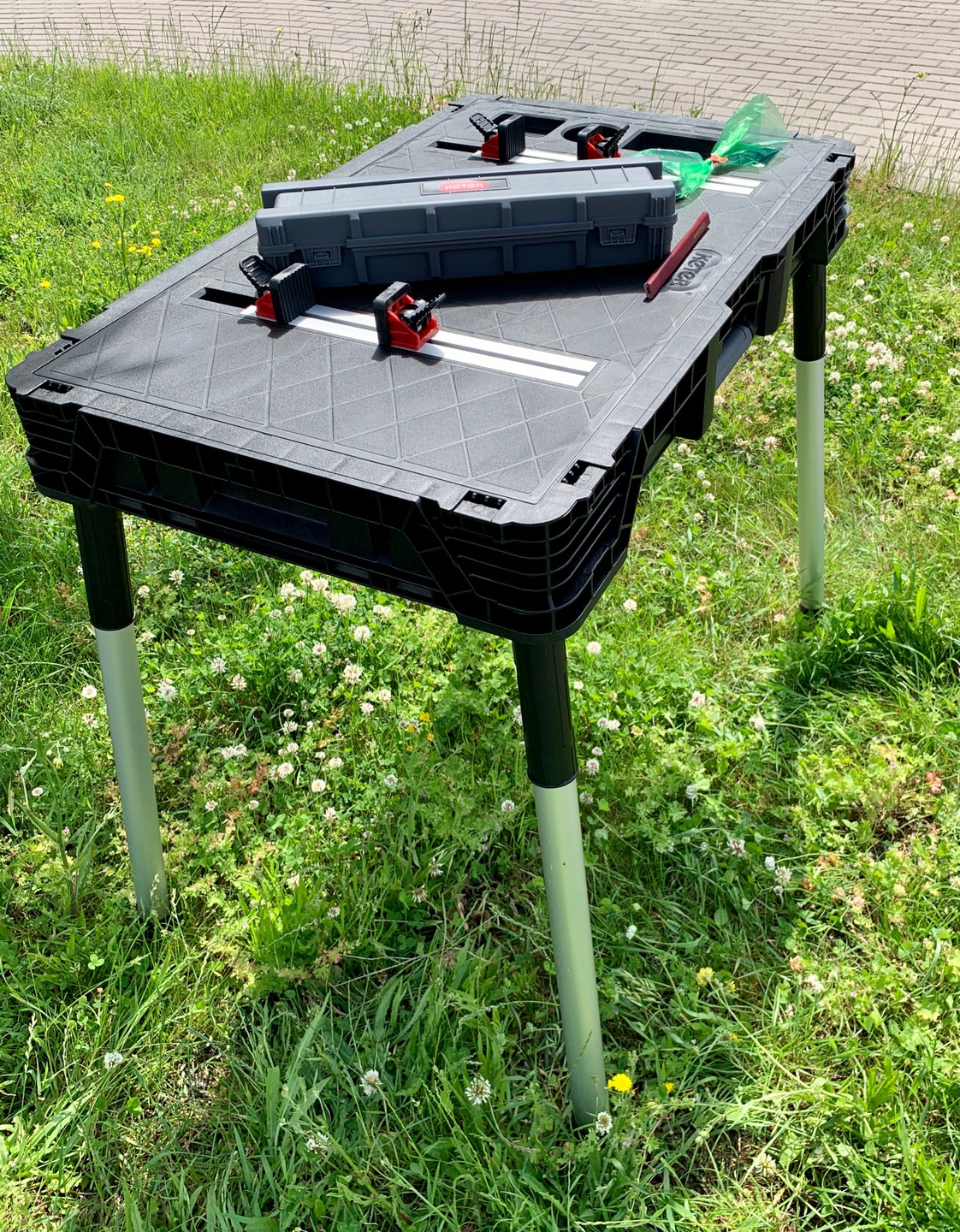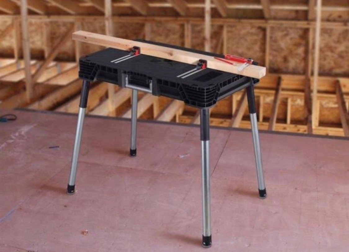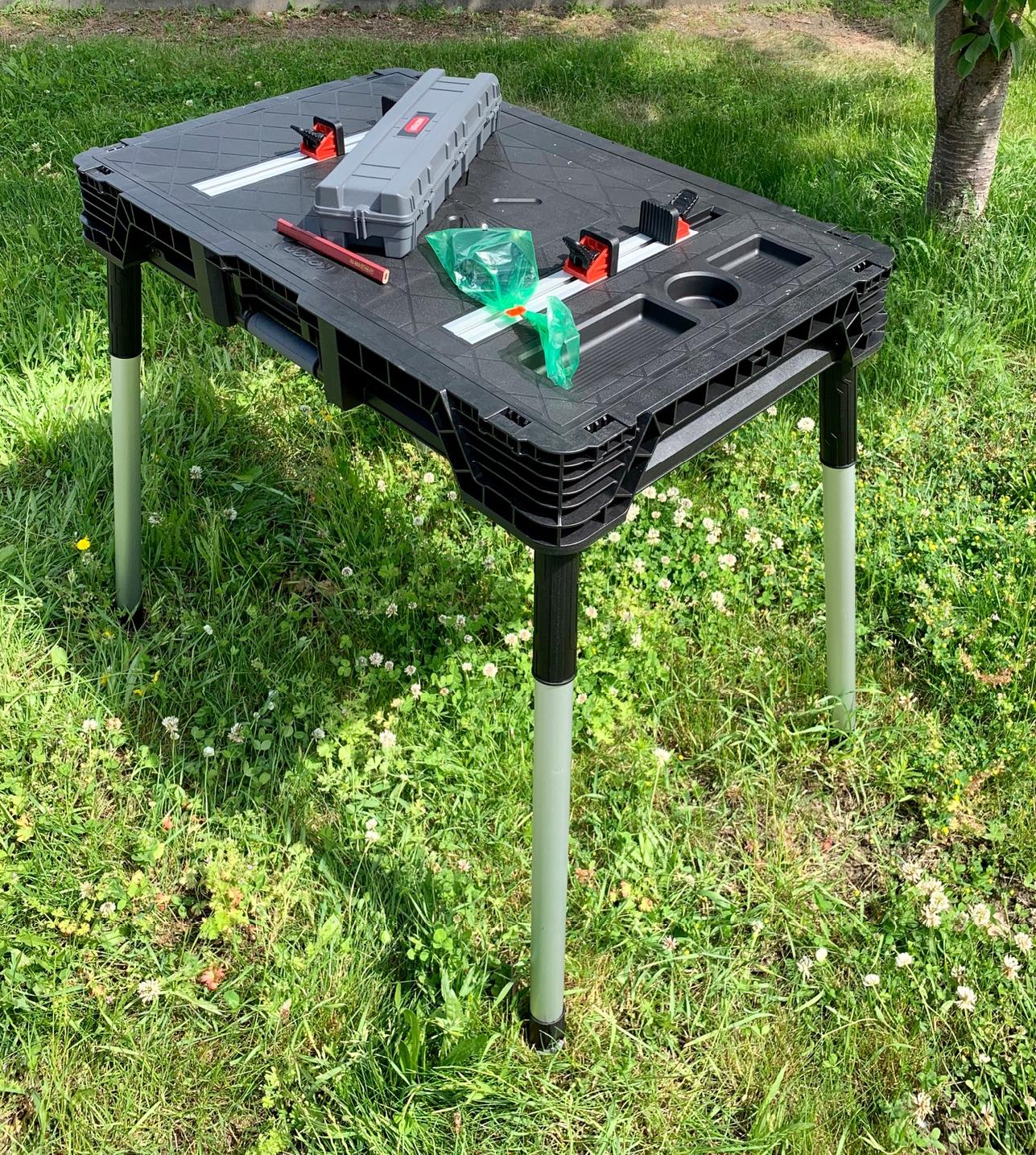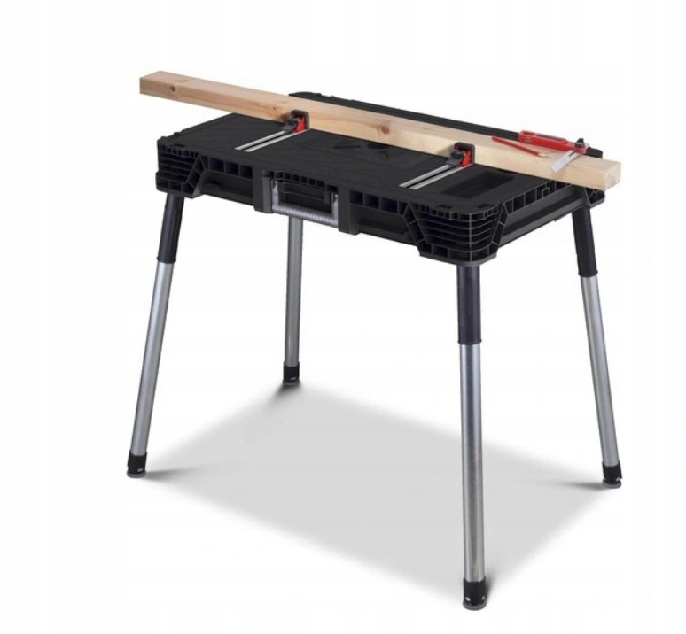 Praktyczny przenośny stół umożliwia pracę w różnych miejscach. Duża przestrzeń robocza stołu wytrzymała do 453 kg / 1000 lbs zapewnia, że można na nim wykonywać również skomplikowane prace. Produkt w zestawie posiada cztery zaciski które zapewniają stabilność powierzchni pracy.