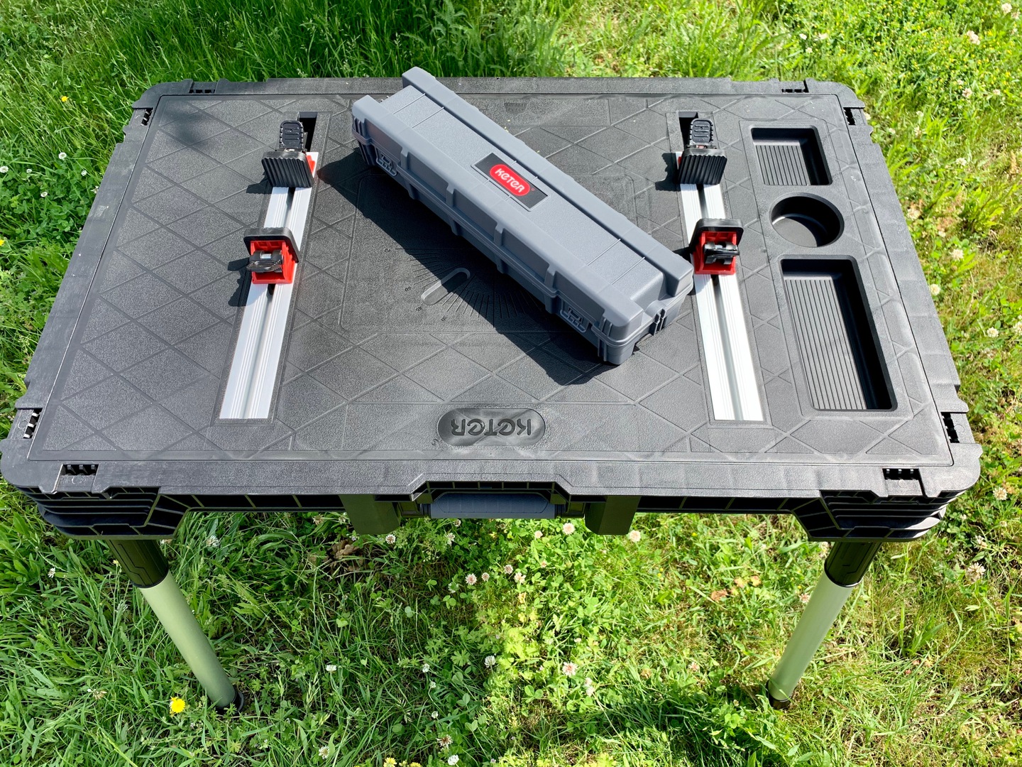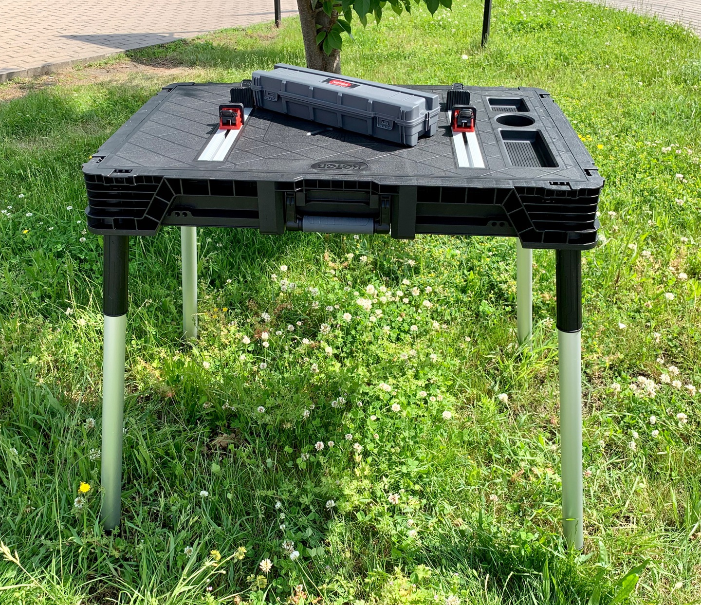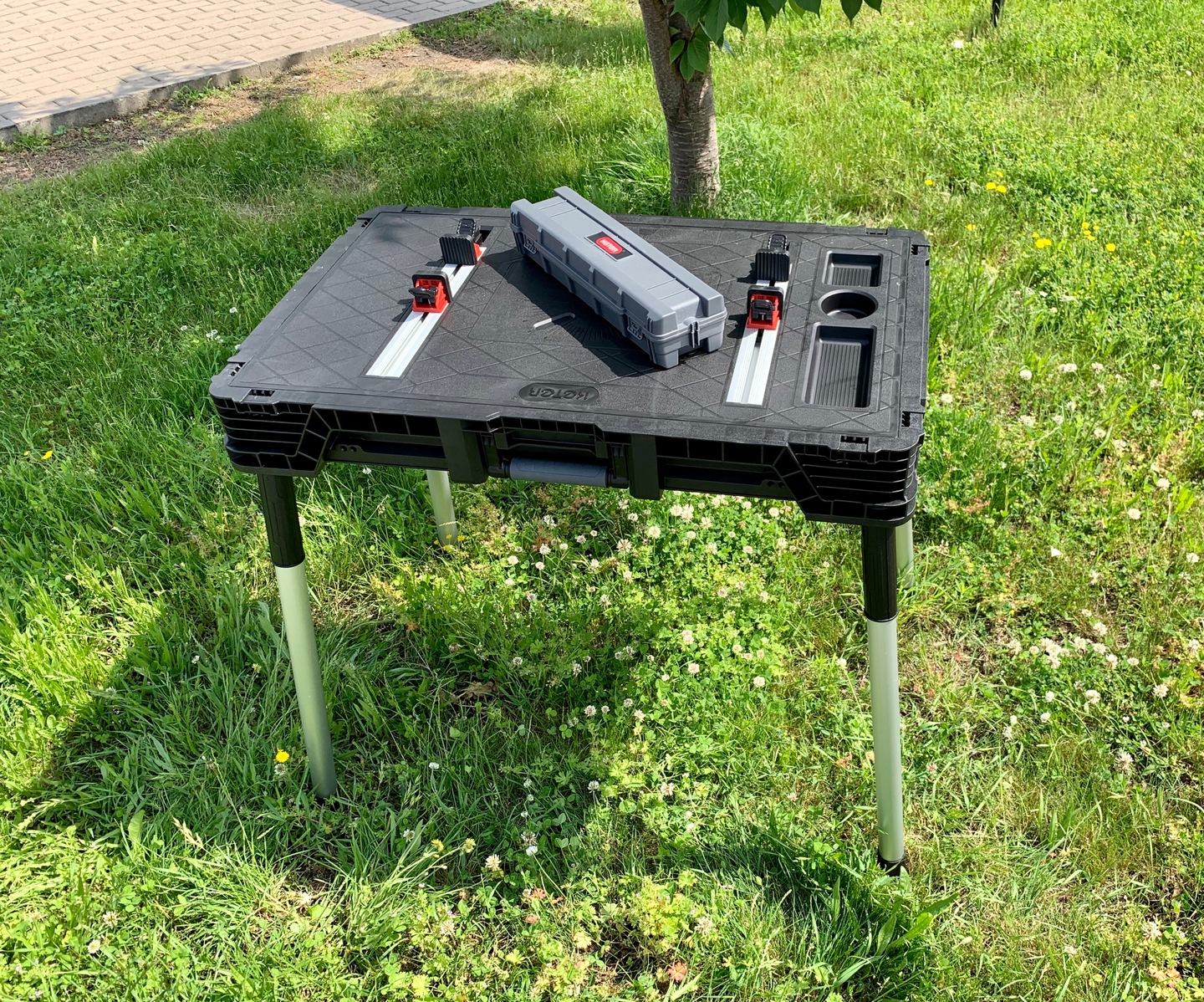 Praktyczny przenośny stół umożliwia pracę w różnych miejscach. Duża przestrzeń robocza stołu wytrzymała do 453 kg / 1000 lbs zapewnia, że można na nim wykonywać również skomplikowane prace. Produkt w zestawie posiada cztery zaciski które zapewniają stabilność powierzchni pracy.
