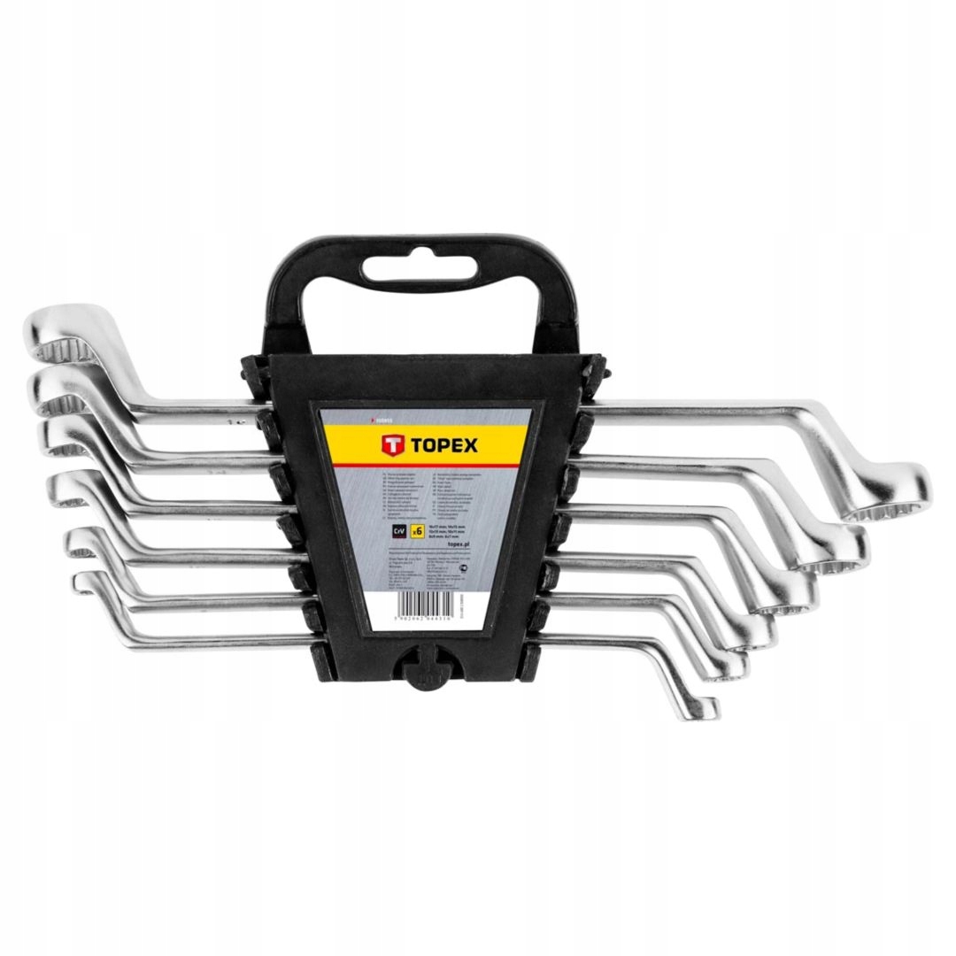 Zestaw kluczy oczkowych odgiętych TOPEX (nr ref. 35D855) bardzo przydatny przy pracach mechanicznych oraz podczas majsterkowania. Klucze po obu stronach posiadają oczka przeznaczone do dokręcania i wykręcania śrub sześciokątnych. Dzięki swojej konstrukcji umożliwiają pracę przy śrubach umieszczonych w zagłębieniach. Wykonane z wytrzymałej stali chromowo-wanadowej. Ułożone w praktycznym opakowaniu z tworzywa sztucznego, co ułatwia przechowywanie. Marka TOPEX skierowana jest do majsterkowiczów.