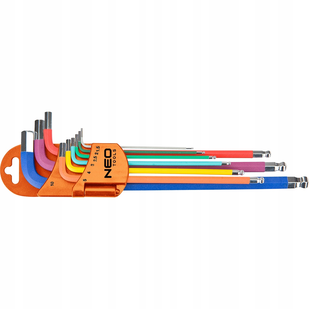 Zestaw kluczy sześciokątnych NEO (nr ref. 09-512) wykonany zgodnie z normą DIN 911. Zestaw zawiera 9 kluczy w rozmiarze od 1.5 do 10 mm w praktycznym opakowaniu. Kuliste końcówki o kącie roboczym do 30° zwiększają funkcjonalność narzędzi. Kolorowy kod ułatwia wybór rozmiaru. Wysokogatunkowa stal stopowa S2 zapewnia długoletnią wytrzymałość kluczy. Certyfikat TÜV, ISO 2936 i 25-letnia gwarancja producenta potwierdzają wysoką jakość narzędzia. Marka NEO spełnia oczekiwania profesjonalistów.