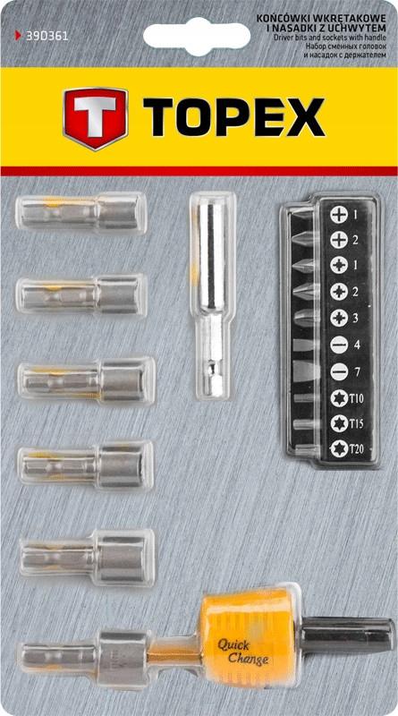 Zestaw końcówek wkrętakowych i nasadek TOPEX (nr ref. 39D361) to praktyczny komplet dla każdego majsterkowicza. W komplecie znajdują się m.in. nasadki wkrętakowe i końcówki wkrętakowe. Zestaw ma wszechstronne zastosowanie w drobnych pracach montażowych, naprawach pojazdów i maszyn oraz innych pracach w domu i garażu każdego majsterkowicza. Marka TOPEX skierowana jest do majsterkowiczów.