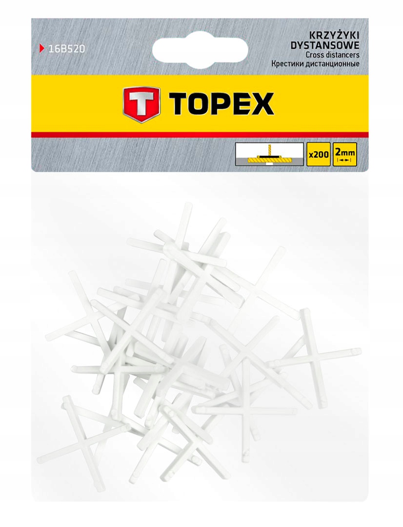 Krzyżyki dystansowe TOPEX (nr ref. 16B520) w rozmiarze 2 mm. Znajdują swoje zastosowanie podczas prac glazurniczych. Wykonane z wysokiej jakości tworzywa sztucznego. Marka TOPEX skierowana jest do majsterkowiczów.