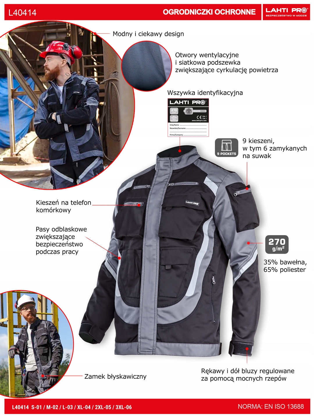 MATERIAŁ: 35% bawełna, 65% poliester. 9 kieszeni, w tym 6 zamykanych na suwak. Kieszeń na telefon komórkowy. Zamek błyskawiczny. Otwory wentylacyjne i siatkowa podszewka zwiększające cyrkulację powietrza. Pasy odblaskowe zwiększające bezpieczeństwo podczas pracy. Rękawy i dół bluzy regulowane za pomocą mocnych rzepów. Modny i ciekawy design. Wszywka identyfikacyjna. NORMA: EN ISO 13688.