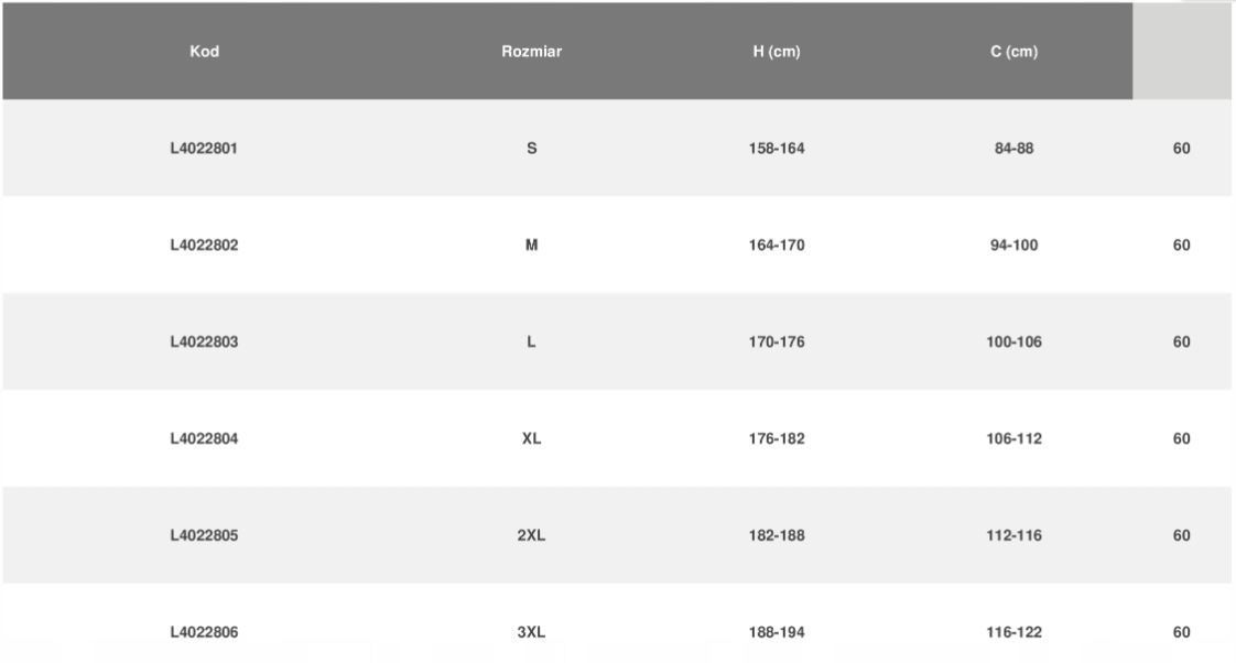 EN ISO 13688 - Norma Międzynarodowa określa ogólne wymagania, dotyczące wykonania, z zakresu ergonomii, nieszkodliwości, oznaczania wielkości, procesu starzenia, kompatybilności i znakowania odzieży ochronnej oraz informacji, które powinien dostarczać producent wraz z wyrobem. Niniejsza Norma Międzynarodowa jest przeznaczona do stosowania tylko w połączeniu z innymi normami określającymi wymagania dla konkretnego wykonania i nie może być stosowana jako samodzielny dokument bazowy). Poniżej tabela z rozmiarami dla lepszego doboru odzieży.