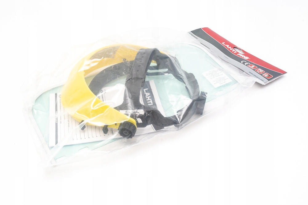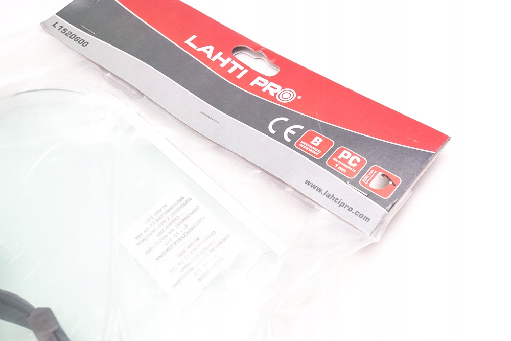 Osłona twarzy przeciwodpryskowa z daszkiem i regulowanym nagłowiem polskiego producenta Lahti Pro L1520600 wykonana z poliwęglanu o grubości 1,0 mm i długości osłony 20 cm. Osłona posiada plastikowe nagłowie z napotnikiem, regulacją obwodu głowy (pokrętło) oraz bardzo lekką konstrukcję i bardzo dobrą funkcjonalność oraz zapewnia częściową ochronę szyi. Osłony twarzy marki Lahti Pro model L1520600 są w drugiej kategorii środków ochrony indywidualnej, posiadają klasę odporności B, deklarację CE oraz zgodne są z normą EN 166. Osłona twarzy z szybką z tworzywa sztucznego przeznaczona do ochrony oczu i twarzy przed odpryskami ciał stałych, powstającymi podczas pracy m.in. przy ręcznej i maszynowej obróbce metali, drewna i tworzywa o średniej energii uderzenia (odpowiadającej uderzeniu kulką o masie 0,86g z prędkością 120m/s). Osłona może również chronić oczy i twarz przed rozbryzgami cieczy szkodliwych kwasów: siarkowy, solny, siarkowodorowy, azotowy, fosforowy, alkoholi o niskim stężeniu np. 25% stężenia amoniaku, alkohol z wyjątkiem metylowego, węglowodorów alifatycznych, detergentów, paliwa, oleje mineralne, zwierzęce, roślinne, oleje silnikowe.
