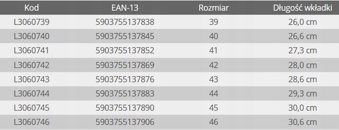 Wyściółka : wymienna ( wkładki z elastyczną poduszką tłumiąca wstrząsy oraz podkładką łagodzące nacisk stopy na podłodze )