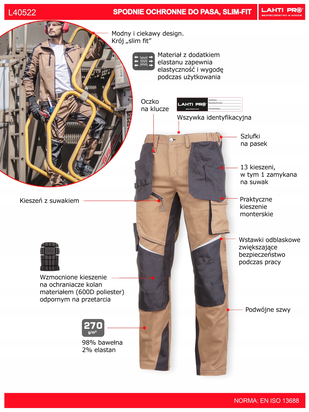 MATERIAŁ: 98% bawełna, 2% elastan. 13 kieszeni, w tym 1 zamykana na suwak. Materiał z dodatkiem elastanu zapewnia elastyczność i wygodę podczas użytkowania. Podwójne szwy. Wstawki odblaskowe zwiększające bezpieczeństwo podczas pracy. Praktyczne kieszenie monterskie. Oczko na klucze. Szlufki na pasek. Wzmocnione kieszenie na ochraniacze kolan materiałem (600D poliester) odpornym na przetarcia. Krój „slim fit”. Modny i ciekawy design. Wszywka identyfikacyjna. NORMA: EN ISO 13688.