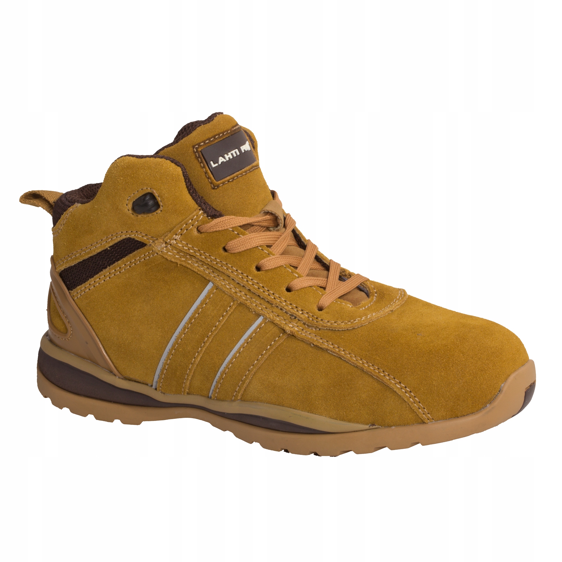 Najnowsze buty z kolekcji Lahti Pro. Wierzch obuwia wykonany ze skóry zamszowej, podszewka z dzianiny siatkowej. Wymienna wyściułka obuwia. Gumowana podeszwa o najnowocześniejszej linii wzorniczej oraz głęboki protektor zapewniają doskonałą stabilność obuwia. Trzewiki posiadają elementy odblaskowe zwiększające bezpieczeństwo podczas pracy. Buty posiadają certyfikat CE oraz spełniają normę ISO 20345:2011. Są w drugiej kategorii środków ochron indywidualnej oraz w kategorii bezpieczeństwa SB (chroni przed uderzeniami o maksymalnym poziomie energii rzędu 200 dżuli i przed ściskaniem rzędu 15 kN) oraz SRA (odporność na poślizg na podłożu ceramicznym pokrytym roztworem laurylosiarczanu sodu)