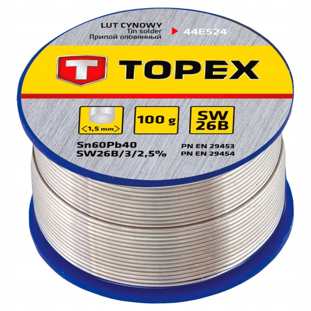 Lut cynowy TOPEX (nr ref. 44E524) zawartość cyny 60%, średnica drutu 1.5 mm, waga 100 g, z topnikiem SW26B. SW26B to topnik do zastosowań w elektronice i elektrotechnice. Spoiwo lutownicze ma zastosowanie głównie w przemyśle elektronicznym, do produkcji standardowych urządzeń i podzespołów elektronicznych, elektrotechnice oraz do lutowania elementów z pokryciami cynowymi, cynowo-ołowiowymi, kadmowymi, cynkowymi i srebrnymi. Marka TOPEX skierowana jest do majsterkowiczów.