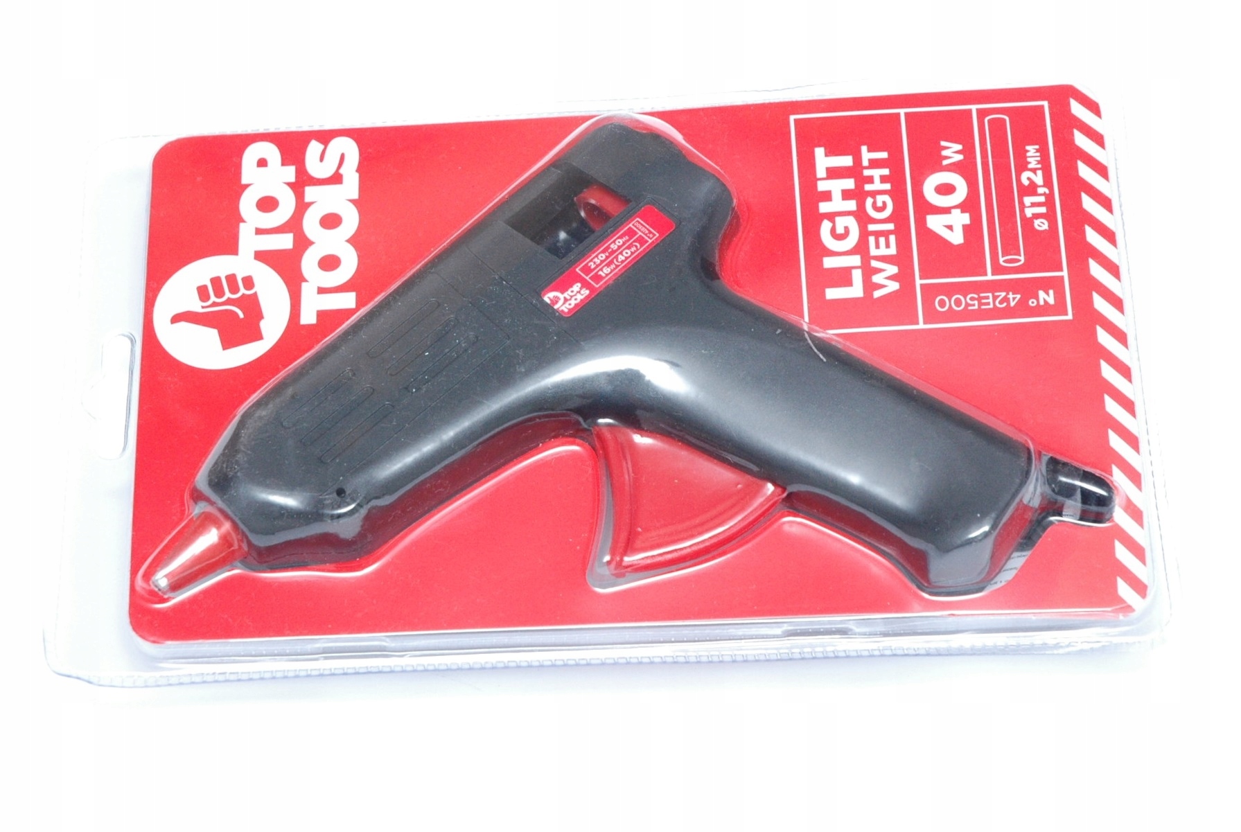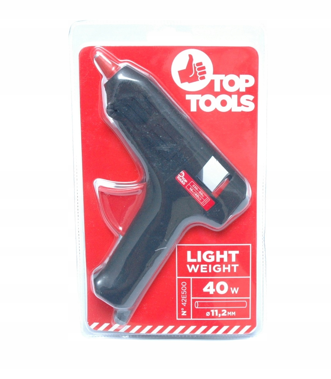 Pistolet klejowy Top Tools (nr ref. 42E500) na klej o średnicy 11.2 mm, o mocy 40W. Końcówka do precyzyjnego nakładania kleju. Idealny do warsztatu majsterkowicza, umożliwia mocowanie wykładziń, produkcę mebli, bizuteri itp. Wydajność 8-12 g/min Zgodność z europejskimi standardami bezpieczeństwa zapewnia certyfikat CE.