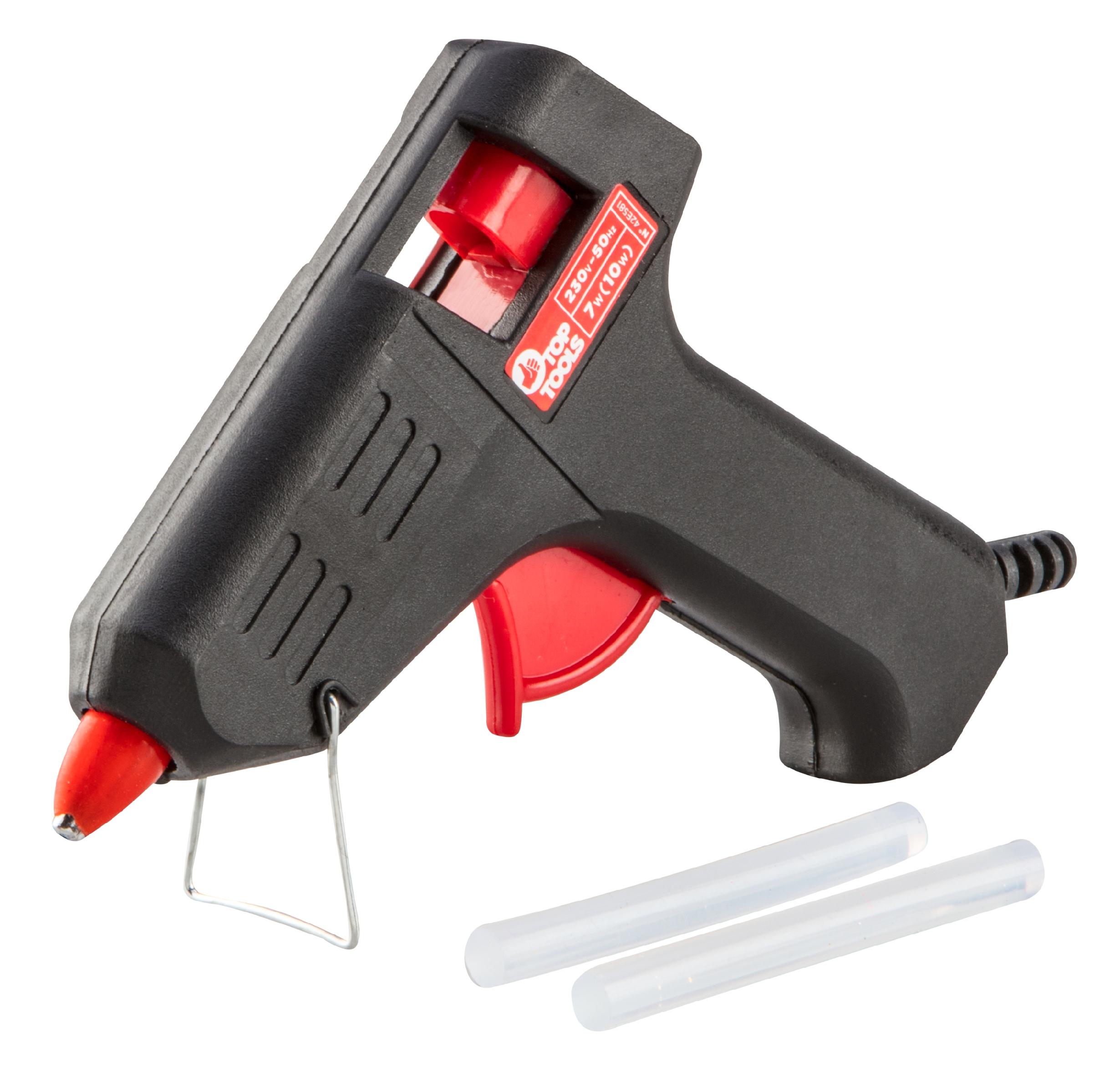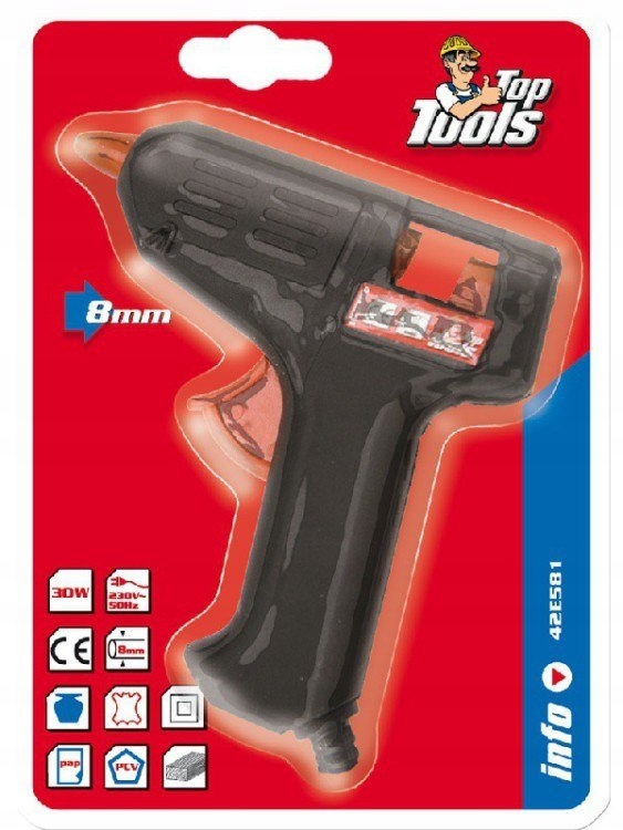 Pistolet klejowy Top Tools (nr ref. 42E581) na klej o średnicy 8 mm, o mocy 10W. Posiada końcówkę do precyzyjnego nakładania kleju. Idealny do warsztatu majsterkowicza, umożliwia mocowanie wykładziń, produkcę mebli, biżuteri itp. Wydajność 6-8 g/min Zgodność z europejskimi standardami bezpieczeństwa zapewnia certyfikat CE.