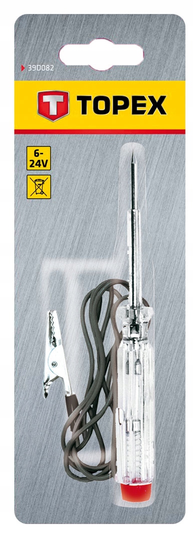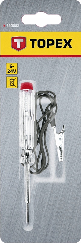 Próbnik instalacji samochodowej TOPEX (nr ref. 39D082) o długości 140 mm. Pozwala wykrywać przepływ napięcia w zakresie 6 - 24V. Posiada kabel z wtyczką do próbnika oraz żabkę, co ułatwia dokonanie pomiaru. Wyprofilowana rękojeść wygodnie leży w dłoni, co podnosi komfort pracy. Zgodność z europejskimi standardami bezpieczeństwa zapewnia certyfikat CE. Marka TOPEX skierowana jest do majsterkowiczów.