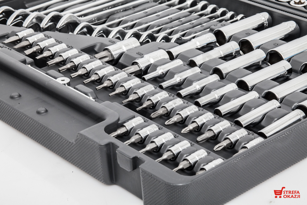 nasadki 1/4" z końcówkami: płaskie 4, 5.5, 6, 7, PH 1, 2, 3, PZ 1, 2, 3, HEX 3, 4, 5, 6, Torx T8, T9, T10, T15, T20, T25, T27, T30, Torx Security T8, T9, T10, T15, T20, T25, T27, T30
