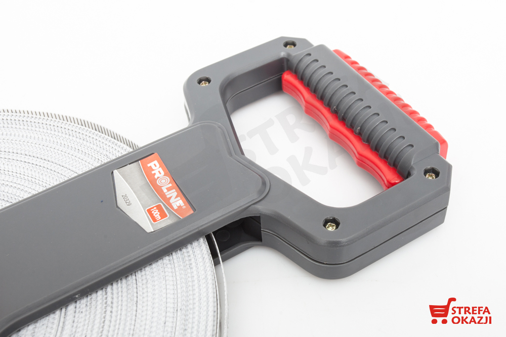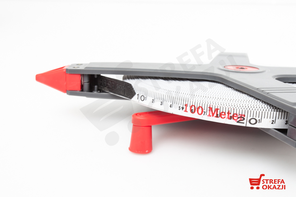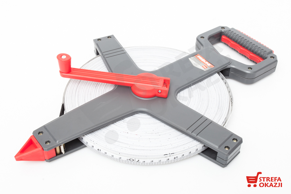 Solidna taśma miernicza w obudowie z wytrzymałego tworzywa. Obudowa zapewnia wygodne rozciąganie taśmy, posiada ergonomiczną profilowaną rękojeść oraz szpiczaste zakończenie dzięki czemu można stabilnie wbić ją w glebę w celu dokonania precyzyjnego pomiaru. Uchwyt posiada dużą składaną korbę do zwijania taśmy z funkcją blokady taśmy. Taśma zakończona metalowym uchwytem z haczykami ułatwiającym przytwierdzenie oraz gumowym zabezpieczeniem przed przypadkowymi przetarciami podczas mocowania. Nadruk miary taśmy duży i czytelny zabezpieczony przed ścieraniem.