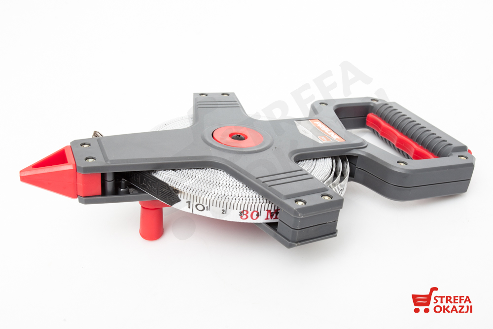 Solidna taśma miernicza w obudowie z wytrzymałego tworzywa. Obudowa zapewnia wygodne rozciąganie taśmy, posiada ergonomiczną profilowaną rękojeść oraz szpiczaste zakończenie dzięki czemu można stabilnie wbić ją w glebę w celu dokonania precyzyjnego pomiaru. Uchwyt posiada dużą składaną korbę do zwijania taśmy z funkcją blokady taśmy. Taśma zakończona metalowym uchwytem z haczykami ułatwiającym przytwierdzenie oraz gumowym zabezpieczeniem przed przypadkowymi przetarciami podczas mocowania. Nadruk miary taśmy duży i czytelny zabezpieczony przed ścieraniem.