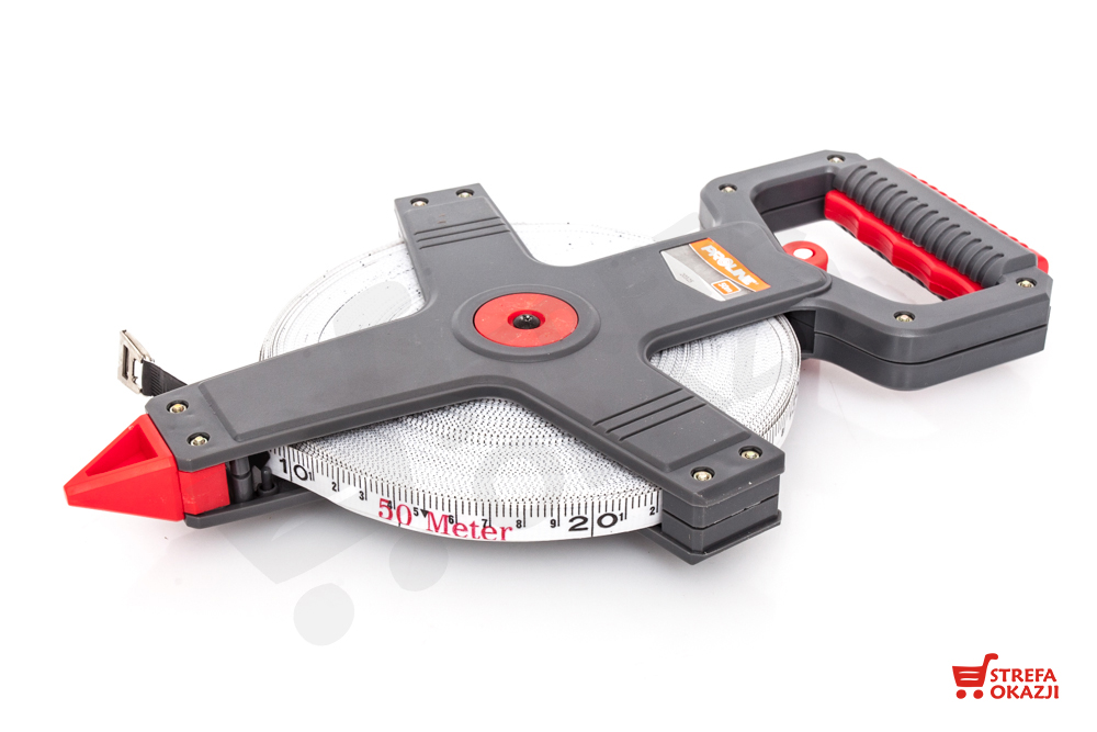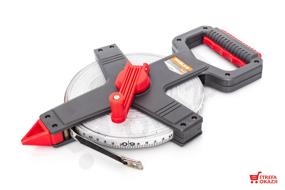 Solidna taśma miernicza w obudowie z wytrzymałego tworzywa. Obudowa zapewnia wygodne rozciąganie taśmy, posiada ergonomiczną profilowaną rękojeść oraz szpiczaste zakończenie dzięki czemu można stabilnie wbić ją w glebę w celu dokonania precyzyjnego pomiaru. Uchwyt posiada dużą składaną korbę do zwijania taśmy z funkcją blokady taśmy. Taśma zakończona metalowym uchwytem z haczykami ułatwiającym przytwierdzenie oraz gumowym zabezpieczeniem przed przypadkowymi przetarciami podczas mocowania. Nadruk miary taśmy duży i czytelny zabezpieczony przed ścieraniem.