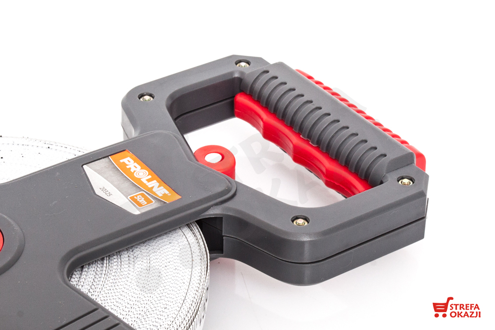 Solidna taśma miernicza w obudowie z wytrzymałego tworzywa. Obudowa zapewnia wygodne rozciąganie taśmy, posiada ergonomiczną profilowaną rękojeść oraz szpiczaste zakończenie dzięki czemu można stabilnie wbić ją w glebę w celu dokonania precyzyjnego pomiaru. Uchwyt posiada dużą składaną korbę do zwijania taśmy z funkcją blokady taśmy. Taśma zakończona metalowym uchwytem z haczykami ułatwiającym przytwierdzenie oraz gumowym zabezpieczeniem przed przypadkowymi przetarciami podczas mocowania. Nadruk miary taśmy duży i czytelny zabezpieczony przed ścieraniem.