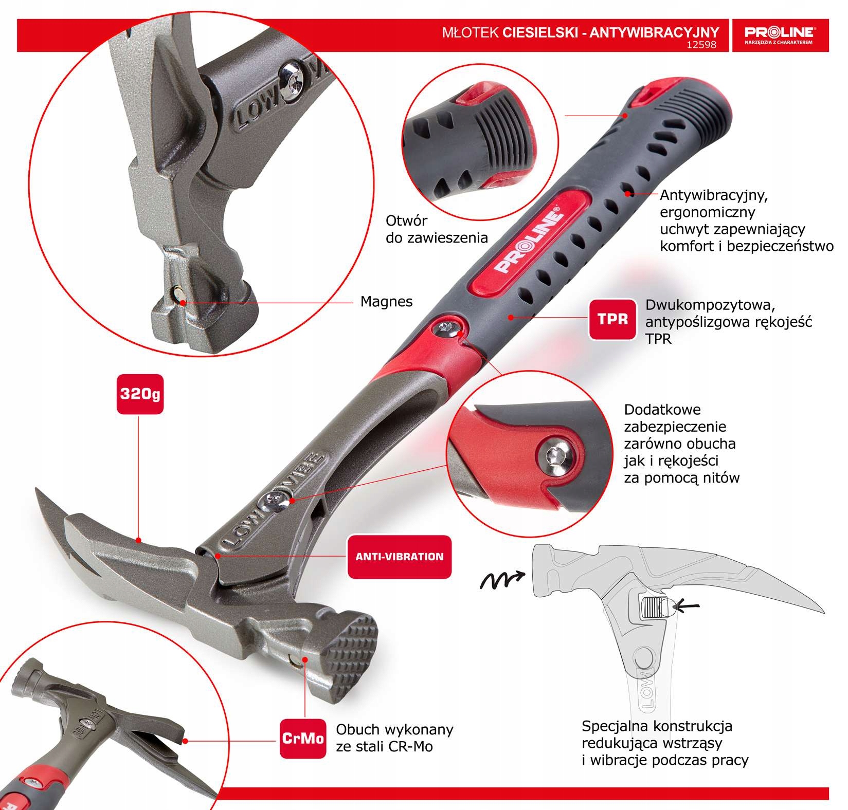 Młotek ciesielski z innowacyjnym systemem antywibracyjnym polskiej marki Proline.