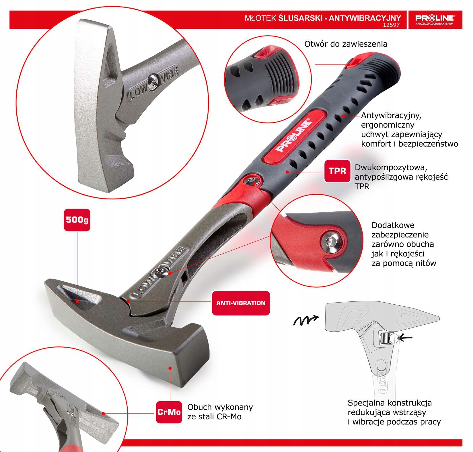 Młotek ślusarski z innowacyjnym systemem antywibracyjnym polskiej marki Proline.