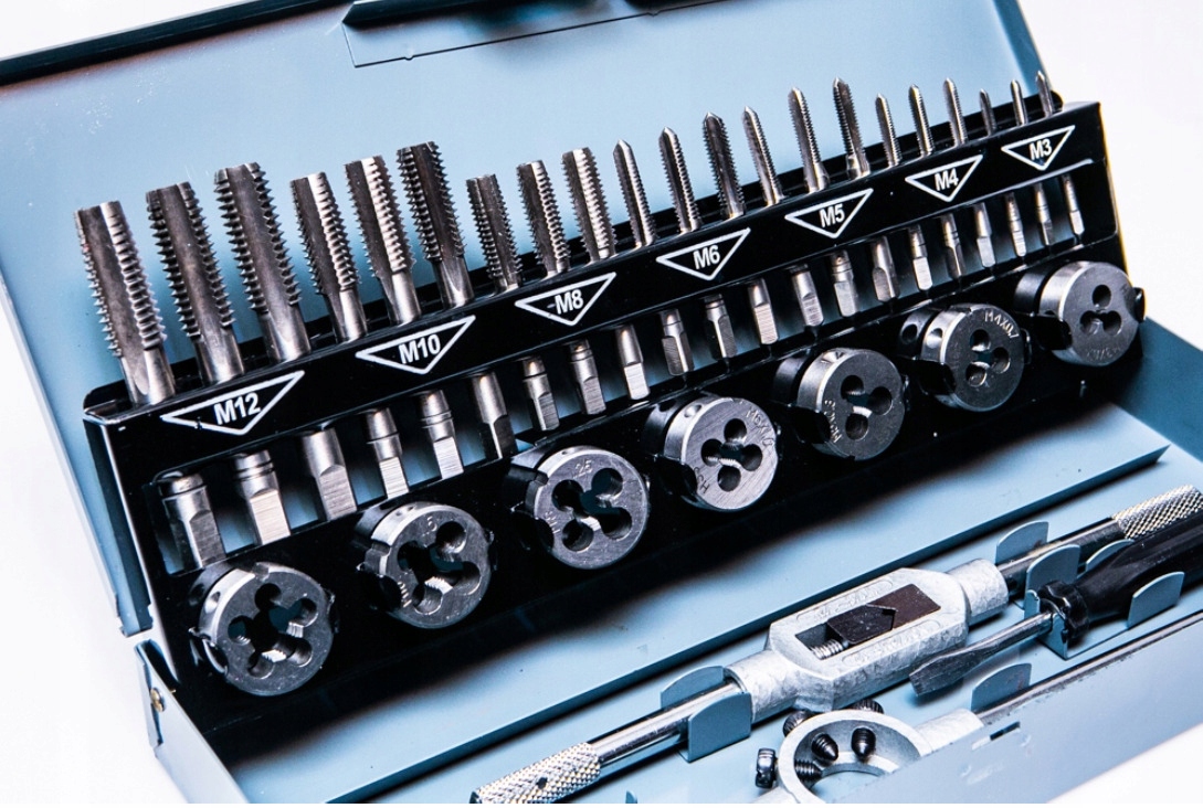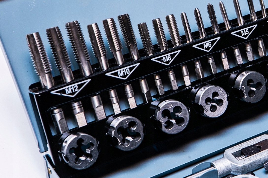 W zestawie komplet 32 sztuk (gwintowniki nr 1, 2, 3 dla każdego rozmiaru oraz narzynki)