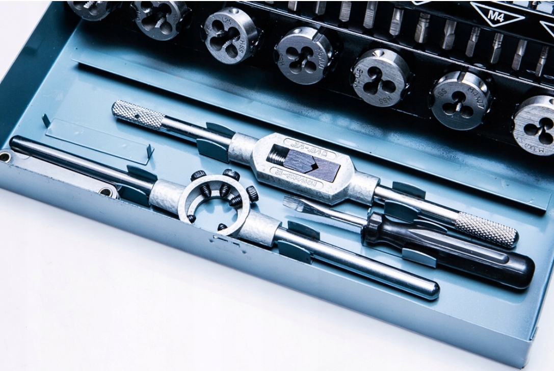 W zestawie dodatkowo pokrętło do gwintowników, oprawka do narzynek,