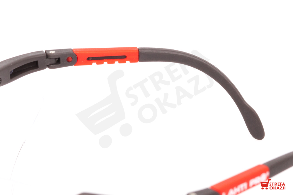 Okulary robocze mają uniwersalny rozmiar z możliwością regulacji zauszników od 5 do 15 mm. Można również regulować kąt nachylenia soczewek.