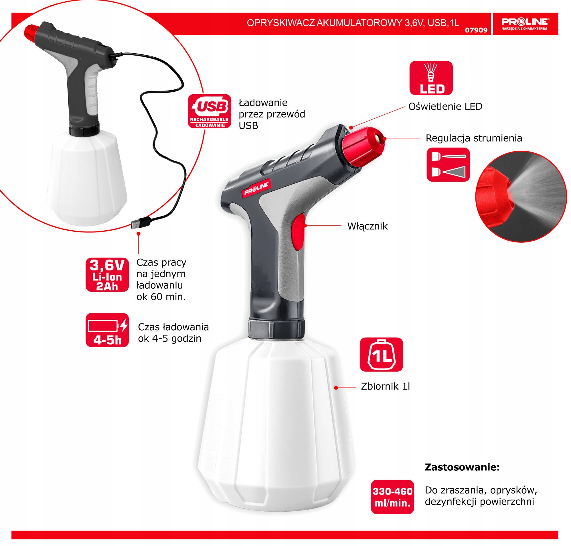 Opryskiwacz akumulatorowy ładowany przez port USB. Do zraszania, oprysków i dezynfekcji powierzchni. Czas pracy na jednym ładowaniu ok. 60 min. Czas ładowania około 4-5 godzin . Oświetlenie LED i regulacja strumienia.