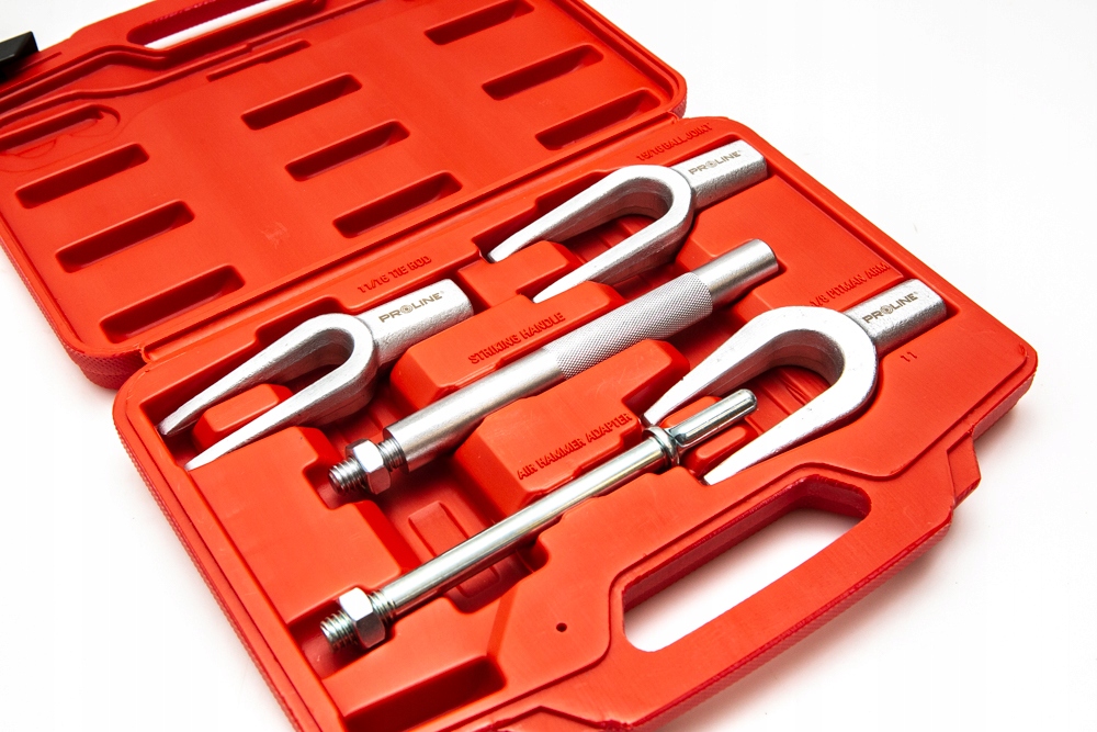 Zestaw ściągaczy do sworzni czyli do drążków kierowniczych wykonany jest z chromowanej powierzchniowo stali węglowej. Ściągacze do sworzni dostosowane są do pracy z młotkiem pneumatycznym lub ręcznym a ramiona widelców w ściągaczach posiadają twarde i równe powierzchnie klinowe, co pozwala na łatwe i precyzyjne uwolnienie zapieczonych sworzni oraz drążków kierowniczych. Ściągacze do sworzni skracają czas pracy w serwisach i warsztatach samochodowych umożliwiając obsługę samochodów osobowych i dostawczych, zarówno europejskich, amerykańskich jak również japońskich.