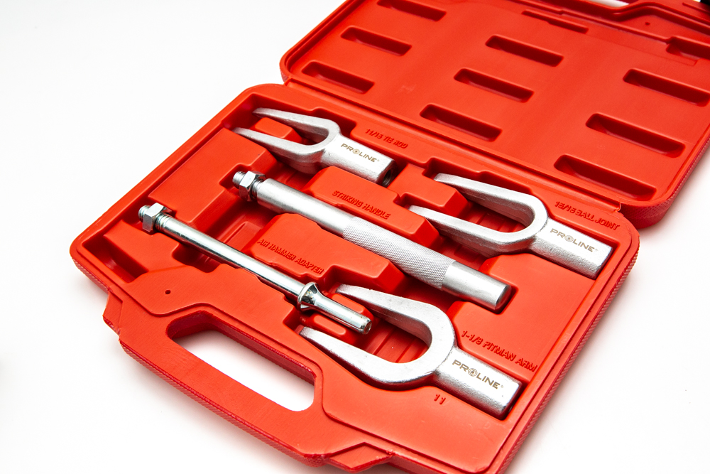 Zestaw ściągaczy do sworzni czyli do drążków kierowniczych wykonany jest z chromowanej powierzchniowo stali węglowej. Ściągacze do sworzni dostosowane są do pracy z młotkiem pneumatycznym lub ręcznym a ramiona widelców w ściągaczach posiadają twarde i równe powierzchnie klinowe, co pozwala na łatwe i precyzyjne uwolnienie zapieczonych sworzni oraz drążków kierowniczych. Ściągacze do sworzni skracają czas pracy w serwisach i warsztatach samochodowych umożliwiając obsługę samochodów osobowych i dostawczych, zarówno europejskich, amerykańskich jak również japońskich.