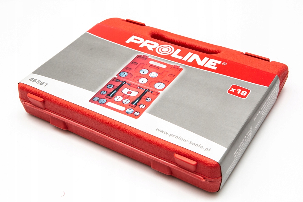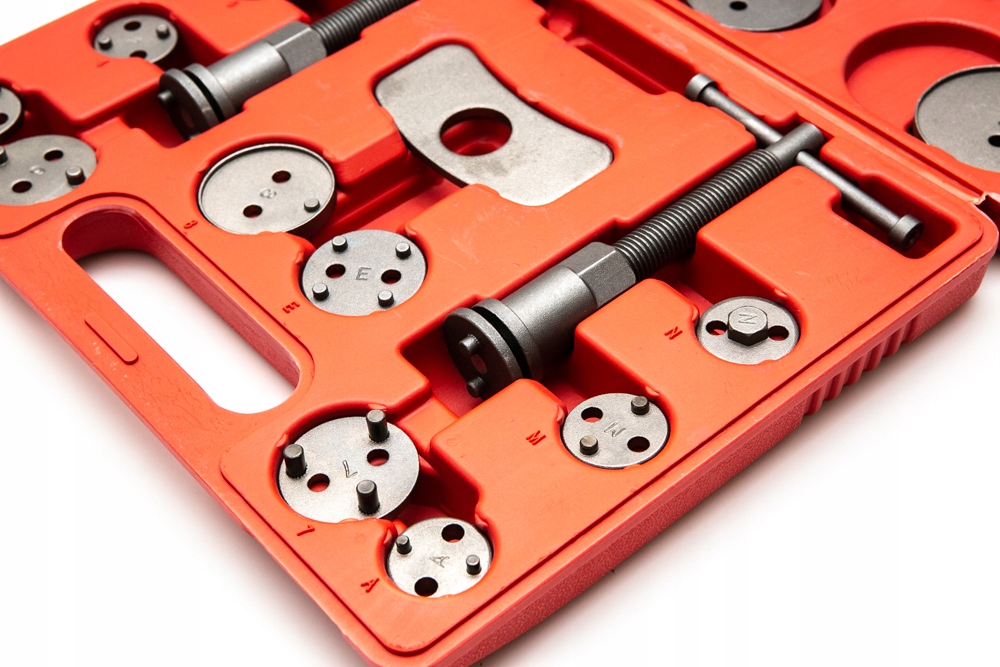 - Profesjonalny, duży, 18 elementowy zestaw do cofania / wyciskania tłoczków w cylinderkach układów hamulcowych, niezbędny przy naprawach pojazdów wyposażonych w hamulce tarczowe