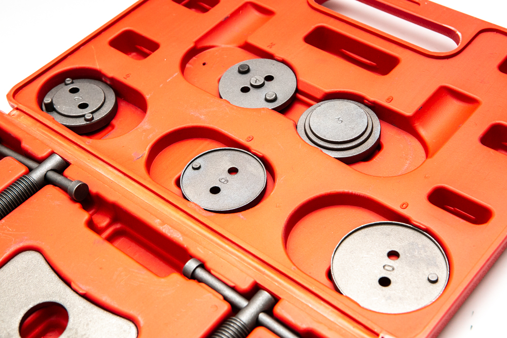 - Profesjonalny, duży, 18 elementowy zestaw do cofania / wyciskania tłoczków w cylinderkach układów hamulcowych, niezbędny przy naprawach pojazdów wyposażonych w hamulce tarczowe