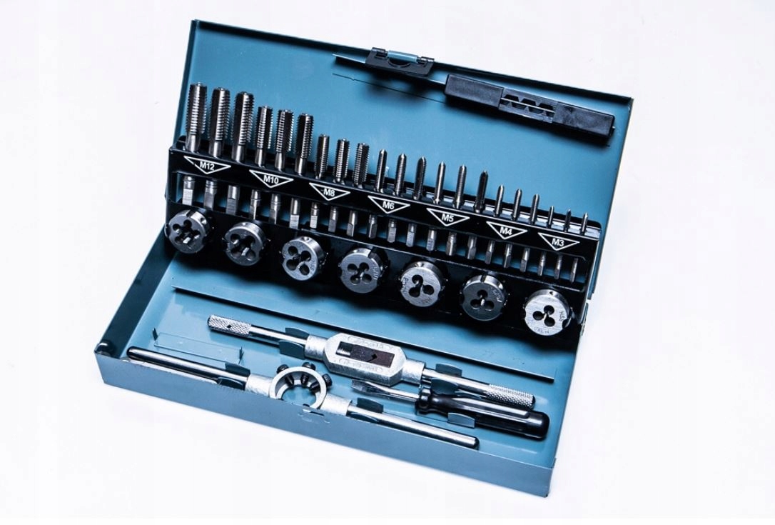 W zestawie komplet 32 sztuk (gwintowniki nr 1, 2, 3 dla każdego rozmiaru oraz narzynki)