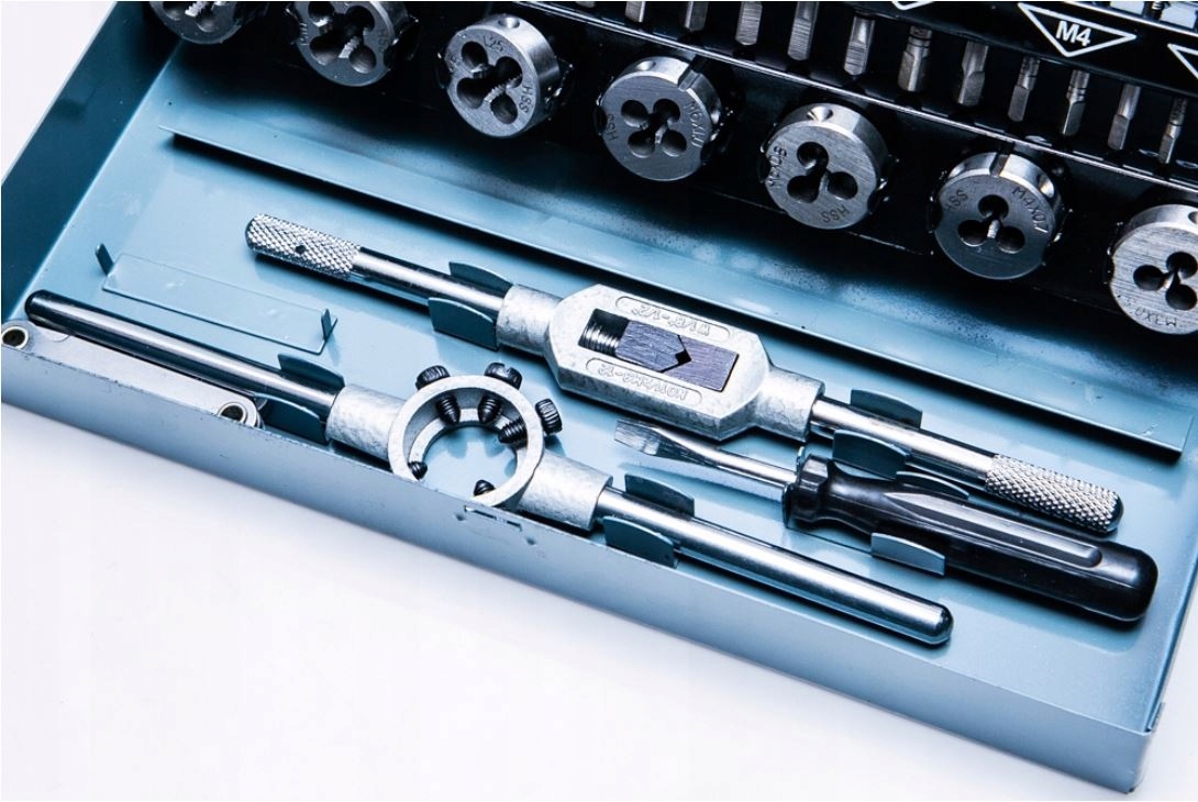 W zestawie dodatkowo pokrętło do gwintowników, oprawka do narzynek,