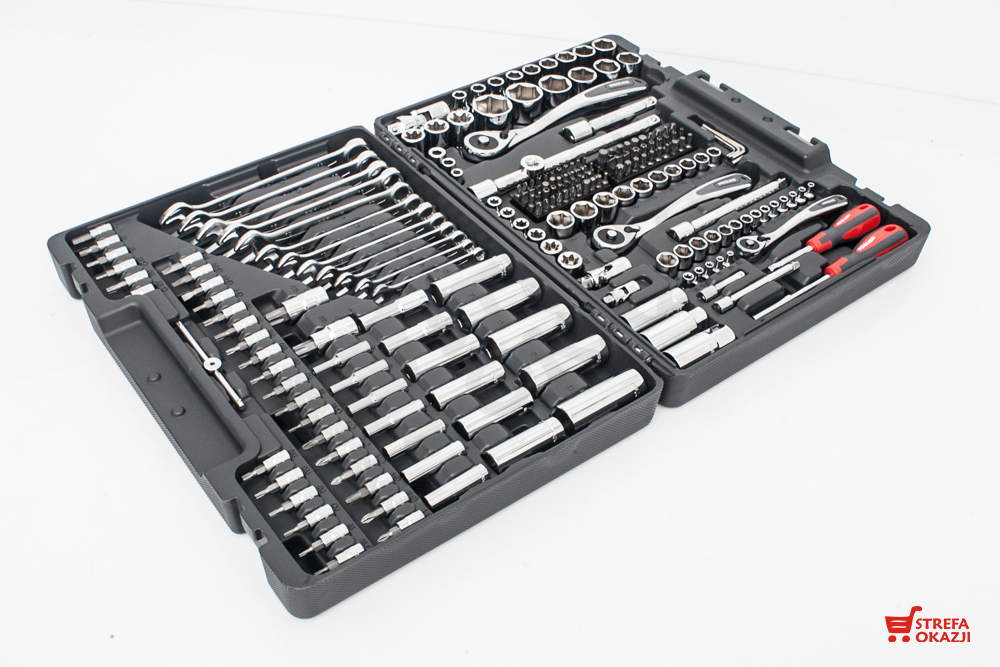 nasadki 1/4" z końcówkami: płaskie 4, 5.5, 6, 7, PH 1, 2, 3, PZ 1, 2, 3, HEX 3, 4, 5, 6, Torx T8, T9, T10, T15, T20, T25, T27, T30, Torx Security T8, T9, T10, T15, T20, T25, T27, T30