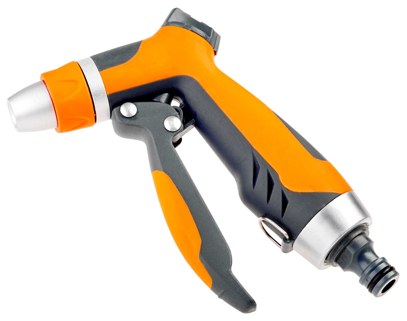 Solidny metalowy korpus, kontrola strumienia wody z lekko działającą dźwignią pistoletową, mosiężna głowica z płynną regulacją strumienia