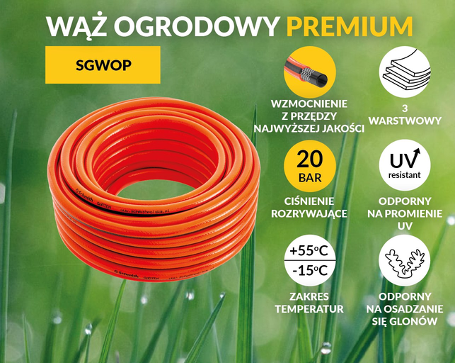Wytrzymały wąż Schmith. Możliwość długoletniego użytkowania dzięki dużej wytrzymałości. Przeznaczony do średniego użytkowania w ogrodzie o strukturze np. trawnika, płyty kamiennej, żwiru.