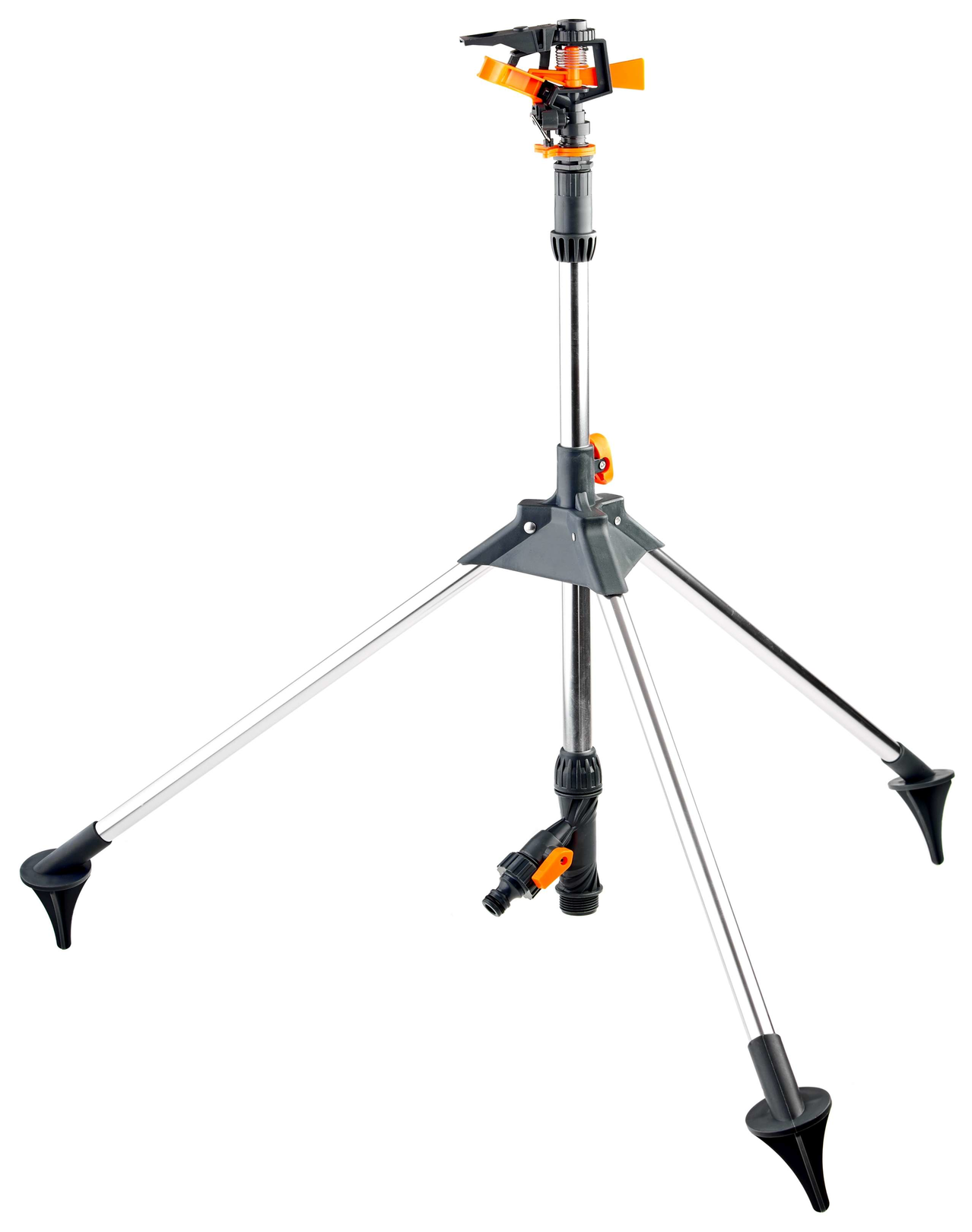 Zraszacz pulsacyjny, wbijany, metalowy. Zraszacz pulsacyjny, metalowy, wbijany na przelotowym kolcu. Regulowana wielkość i kształt pola zraszania. Blokada dla spryskiwania wybranego sektora. Kolec posiada nypel do szybkozłączy i możliwość szeregowego połączenia z innymi zraszaczami.