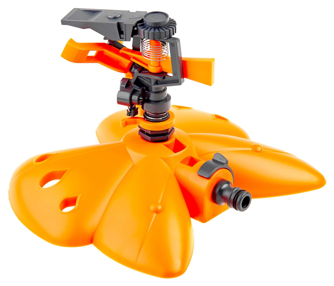 Zraszacz obrotowy 3-ramienny regulowany na podstawie w kształcie motyla. Zraszacz ogrodowy wykonany jest z wysokiej jakości trwałego tworzywa.