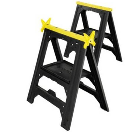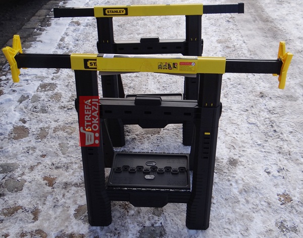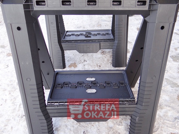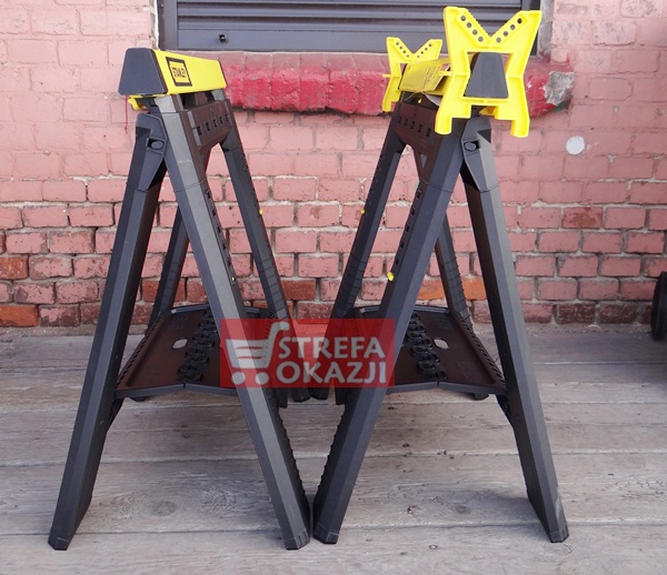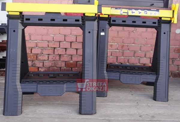 Gumowe wkładki na powierzchni roboczej oraz stopkach zabezpieczają kobyłki oraz obrabiane materiały przed poślizgiem. Dodatkowe zaciski w kształcie litery V do przytrzymywania drewna lub przycinanych rur.