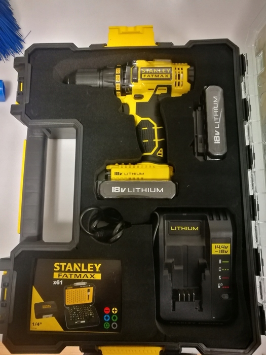 - Wiertarko-wkrętarka STANLEY FATMAX 18 V dostarczana z dwoma akumulatorami Li-Ion o pojemności 1.3Ah
