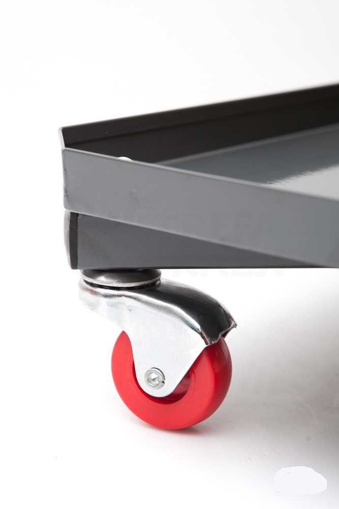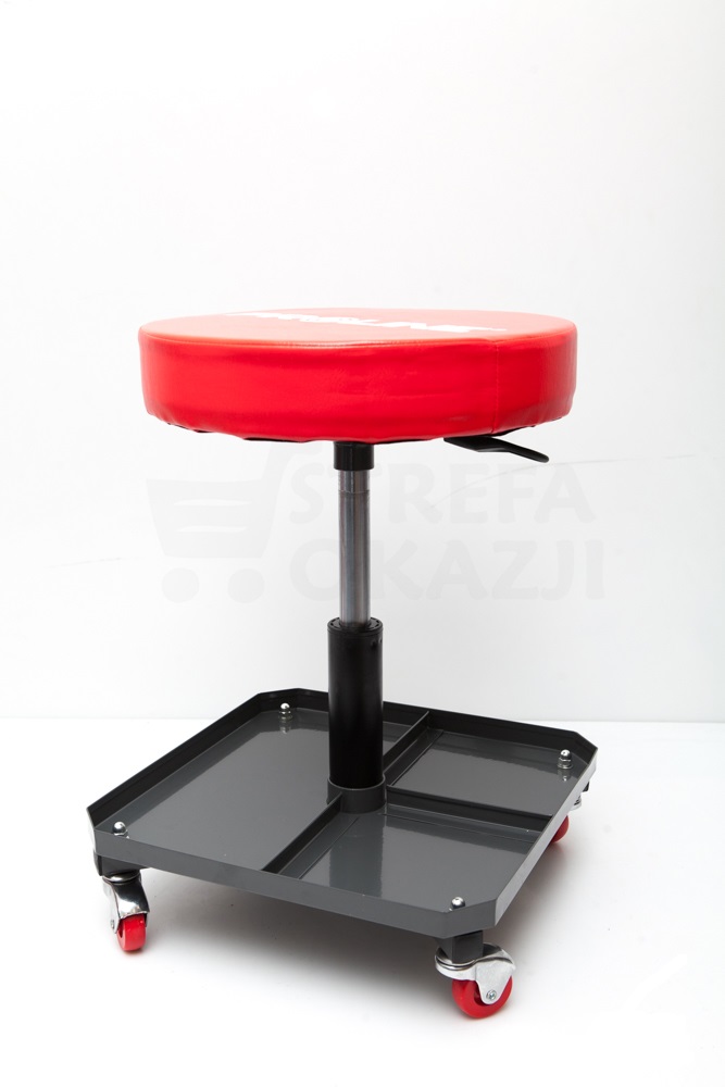 Siedziska są tapicerowane, wyposażone w cztery w pełni obrotowe kółka by wygodnie mieć dostęp do wyposażenie warsztatu.