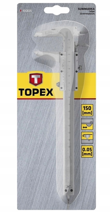 Suwmiarka TOPEX (nr ref. 31C615) o zakresie mierzenia 150 mm i dokładności pomiaru 0,05 mm jest jednym z podstawowych przyrządów pomiarowych. Umożliwia pomiary wewnętrzne i zewnętrzne. Śruba zaciskowa blokująca suwak ułatwia dokonanie pomiaru. Marka TOPEX skierowana jest do majsterkowiczów.