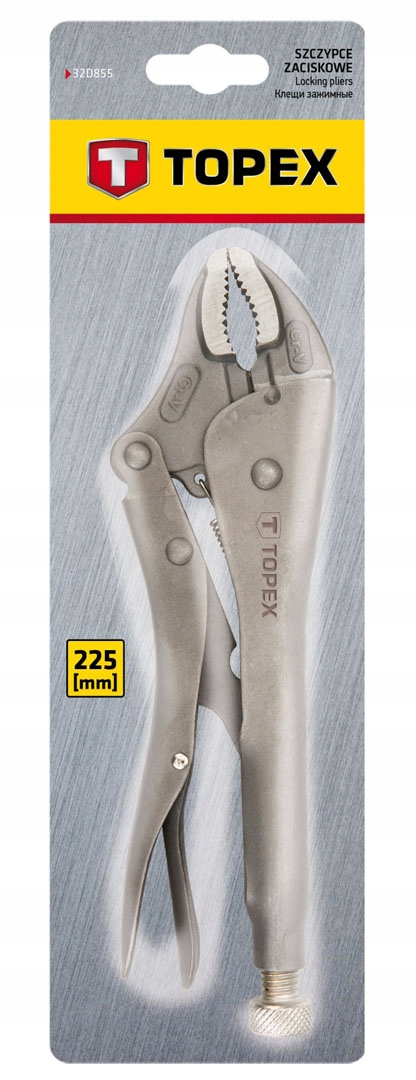 Szczypce zaciskowe TOPEX (nr ref. 32D855) o długości 225 mm i zakresie pracy 0 - 40 mm. Posiadają okrągłe szczęki. Dzięki mechanizmowi zapadkowemu możliwy jest ciągły nacisk na element. Wykonane z wysokiej jakości stali chromowo-wanadowej, zapewniającej długoletnią żywotność produktu. Marka TOPEX skierowana jest do majsterkowiczów.