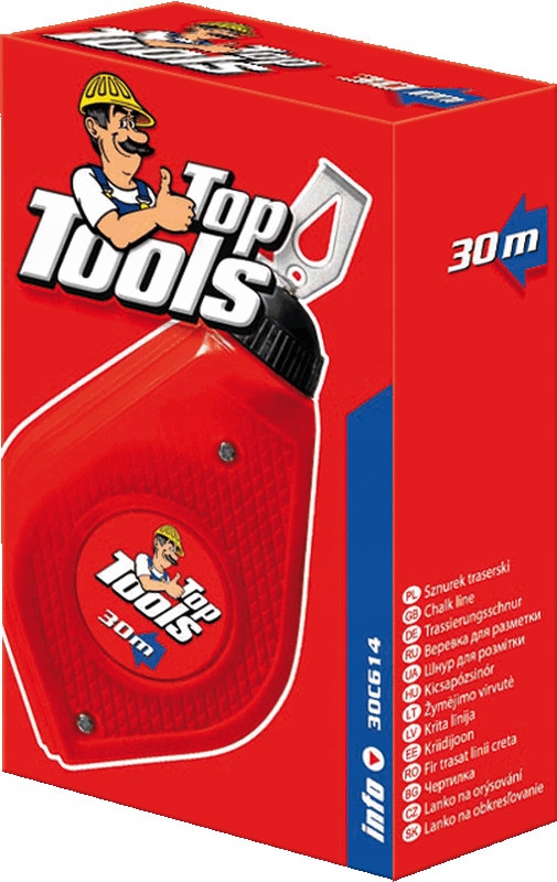 Sznurek traserski Top Tools (nr ref. 30C614) o długości 30 m., to podstawowe narzędzie przy pracach budowlanych i instalacyjnych. Pozwala na wyznaczanie prostych linii na ścianach, podłogach itp. Obudowa wykonana z tworzywa sztucznego.
