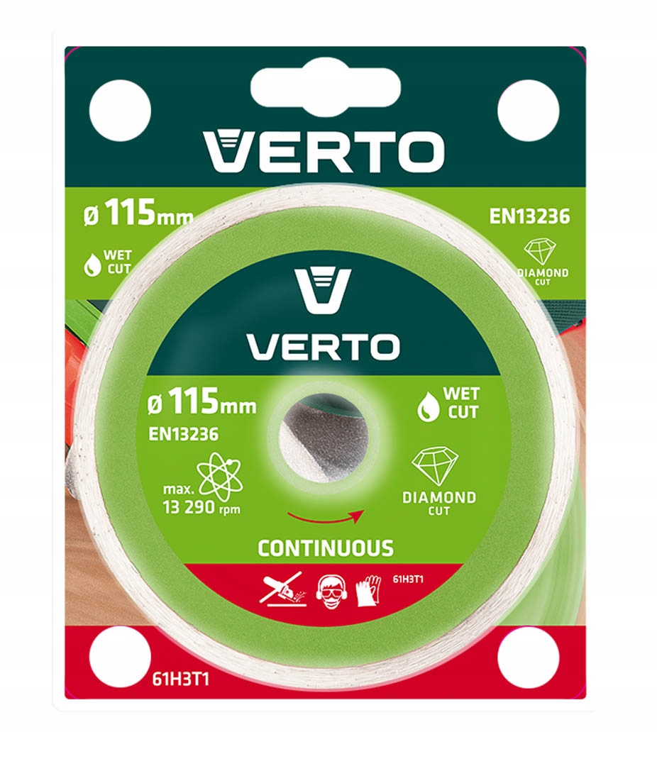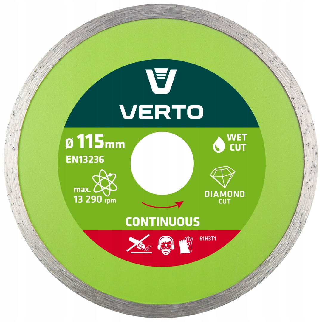Tarcza diamentowa pełna VERTO (nr ref. 61H3T1) o średnicy zewnętrznej 115 mm, przeznaczona do precyzyjnego cięcia elementów ceramicznych, takich jak terakota, gres, granit, marmur. Marka VERTO oferuje asortyment elektronarzędzi i akcesoriów dla każdego majsterkowicza.